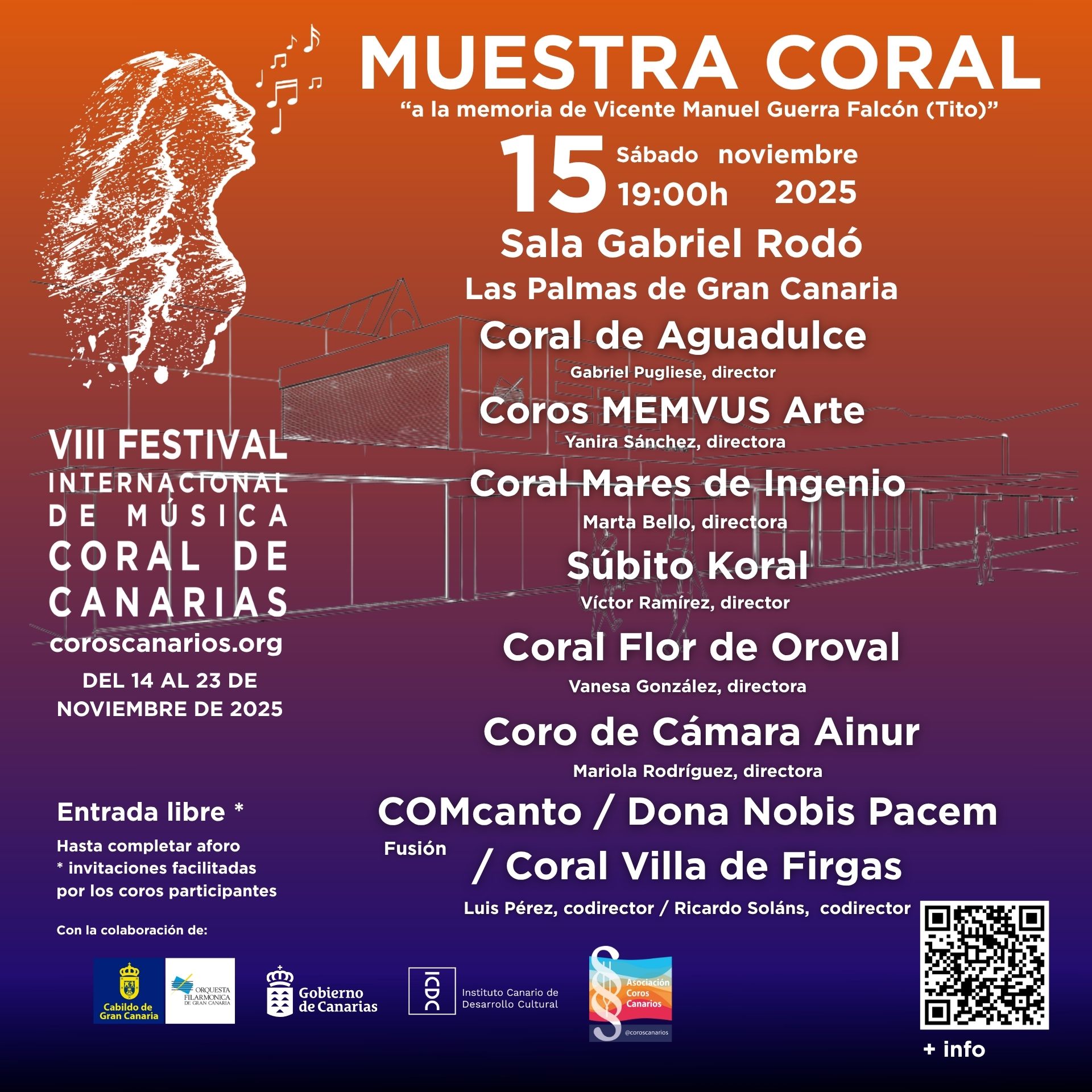 En esta edición intervendremos en el concierto del sábado 15 de noviembre a las 19:00 en la Sala Gabriel Rodó (plaza de la música, Las Palmas de Gran Canaria) y también el domingo 16 a las 18:00 horas en la Sala San Pedro Mártir de Telde junto con otros cinco coros.